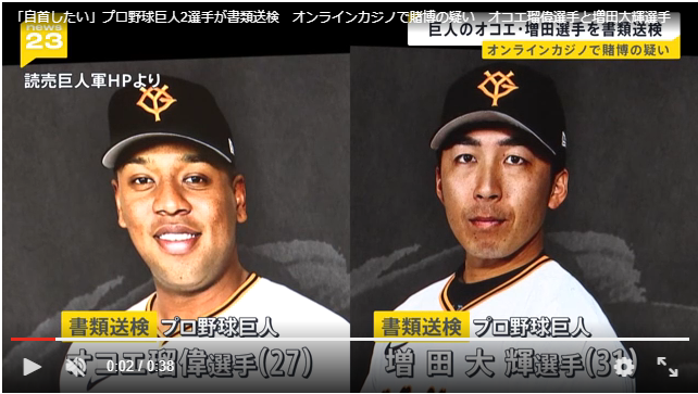 オンラインカジノで賭博をしたとして、プロ野球巨人のオコエ瑠偉選手と増田大輝選手が書類送検されました。 2人がアクセスしたのは海外で運営されているオンラインカジノで、オコエ選手は700万円ほどを賭けておよそ450万円のマイナス、増田選手は300万円ほどを賭けておよそ230万円のマイナスだったとみられています。 読売巨人軍によると、2人はNPBが利用者に名乗り出るよう呼びかけた直後に「自首したい」と申し出たということです。