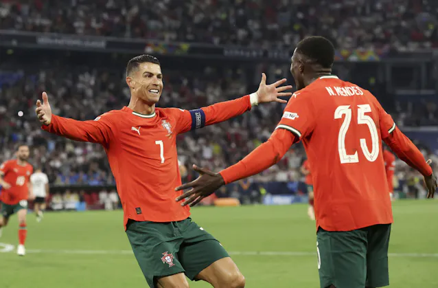ドイツ戦でゴールを決め、喜ぶポルトガルのロナルド㊧(4日、ミュンヘン)=ゲッティ共同 【ロンドン=共同】サッカーの欧州ネーションズリーグは4日、ミュンヘンで準決勝の1試合が行われ、ポルトガルがドイツに2-1で逆転勝ちした。1-1の後半23分にロナルドが勝ち越し点を決めた。8日の決勝でスペイン―フランスの勝者と顔を合わせる。