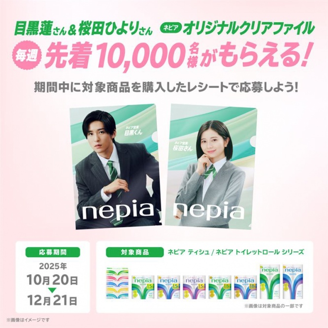 目黒蓮&桜田ひより・ネピアオリジナルクリアファイルを、毎週先着10,000名様・総計90,000名様がもらえるキャンペーンを10月20日(月)より実施。
