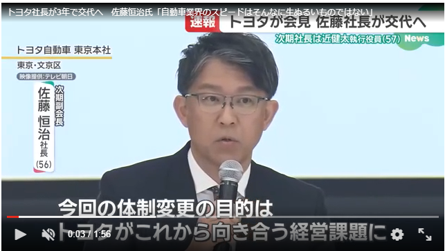 トヨタ自動車は6日、今年4月に社長を交代する人事を発表しました。 「今回の体制変更の目的は、トヨタがこれから向き合っていく経営課題に全力で取り組んでいくためのフォーメーションチェンジ」(次期副会長・佐藤恒治社長) 6日午後3時半から東京で始まった緊急会見。 4月1日付で、佐藤恒治社長(56)が副会長に就任し、近健太執行役員(57)が次の社長に昇格すると発表しました。 豊田章男会長(69)は留任します。