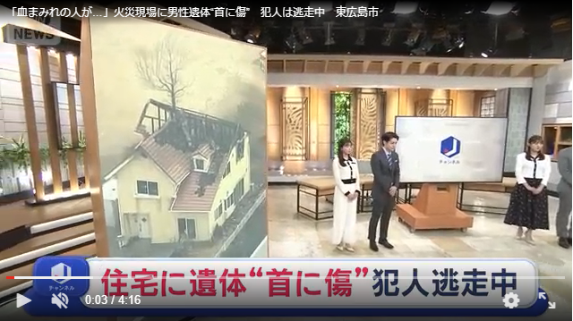 火災が起きた住宅で見つかった男性の遺体には、首を切られたような痕がありました。現場では、男性の妻とみられる女性が助けを求めていました。 ■「血まみれの人が…」犯人逃走中 火災と思われた事態は一転、殺人事件に…。“2つの通報”は何を意味するのでしょうか。 周辺住民 「午前3時すぎにトイレに行ってから寝ようと思ったらサイレンが鳴り出した」 通報があったのは、まだ夜も明けない16日午前3時半ごろ。 消防への通報 「建物2階から火が出ている」 現場は東広島市にある住宅街。火災のあった建物は2階部分が骨組みだけを残し、屋根が崩れ落ちています。 さらに同じ時間帯、もう1件通報が入りました。 警察への通報 「血まみれの人が助けを求めている」 周辺住民 「私は急いでパジャマ着たままであそこの前まで行ってみた。そしたら2階が燃えていた。火が上がって、もう天井が崩れていた」 警察や消防が駆け付けたところ、家の外でこの家の住人とみられる40代男性がうつぶせの状態で倒れていました。その場で死亡が確認されました。 捜査関係者によると、男性の首には切られたような痕があったということです。 2件目の通報にあった、助けを求める「血まみれの人」とは、男性の妻とみられる50代の女性。近隣住民に助けを求めたということです。 女性は外傷がありましたが、命に別状はありませんでした。 2人とも、やけど以外の傷があったということも分かりました。 ■殺人事件とみて捜査 火災が起きた家は夫婦2人暮らし。子どもはいませんでした。事件前のトラブルなどは今のところ確認されていないということです。 住宅には、大型バイクや小型ボートのようなものが見えます。 周辺住民 「(Q.被害があった方との交流は?)トイレを直してもらった」 「(Q.(被害者は)どんな人?)良い人」 「(Q.何度か会ったことあるか?)ある」 「(Q.どんな話した?)『お元気ですか?』って聞いた」 「(Q.ほとんど家にいない?)そうみたい。夕方には帰ってくる。朝出て行って。でも本当そんな感じで何も付き合いもない」 元埼玉県警 捜査1課刑事 佐々木成三氏 「火災で現場がかなり荒らされていると思う。強盗目的かえん恨目的かは判然としないが、ポイントは首が創傷部位ということは、殺意が明確にあった。犯人も複数ではなく1人の可能性が高い。1人を攻撃している時に妻が逃げたとも考えられる。妻の回復を待って詳細な供述を得ることがポイント」 警察は殺人事件とみて捜査しています。